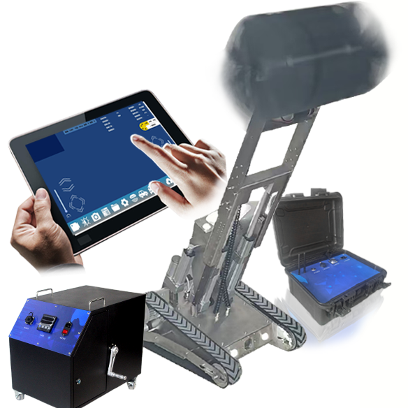 Solution 2 is suitable for cleaning air ducts in large factories, large supermarkets, schools/hospitals, subways/airports (applicable duct size: 400mm - 1200mm). It supports tablet operation, and is equipped with 3 HD cameras to record the cleaning process. It can realize 60m long - distance cleaning and free up - down movement, and is equipped with a high - power fan for dust blowing. The body is made of 304 stainless steel, supporting a maximum extension of 400mm and a maximum cleaning height of 1200mm.