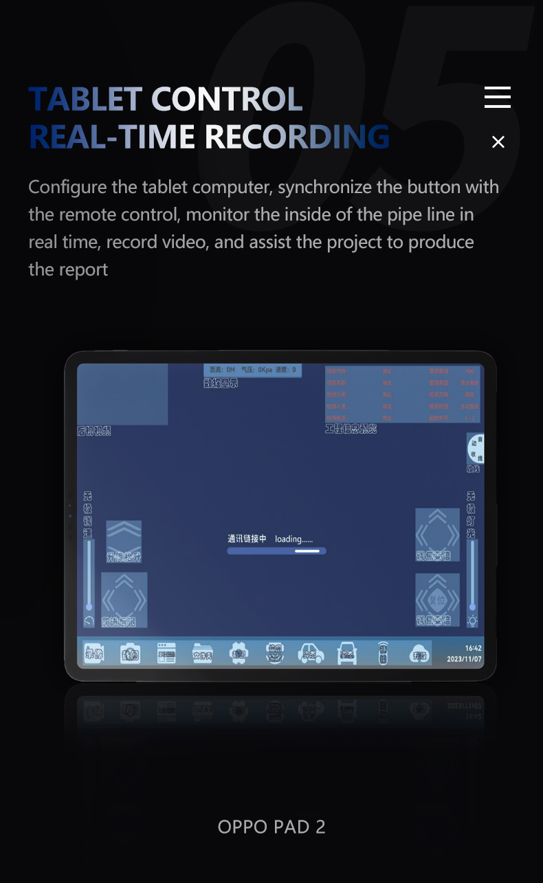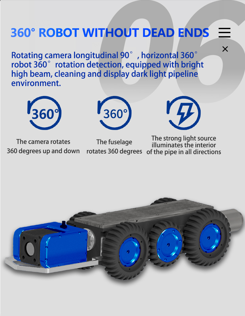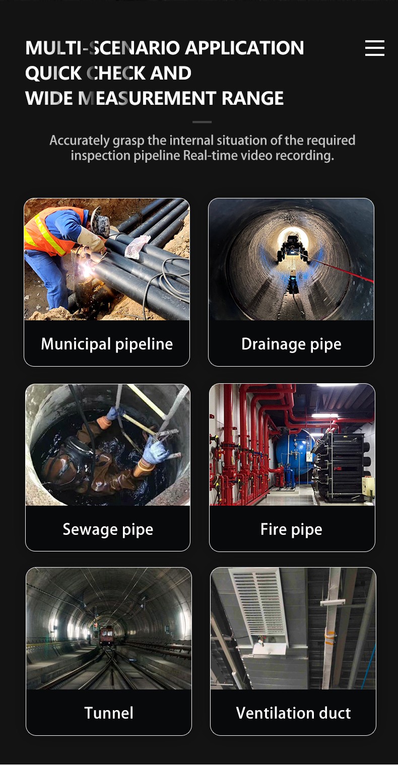 360° Rotatable Camera:Pan/Tilt adjustments for DN190-300 bends, ensuring full-coverage scans in single passes.
