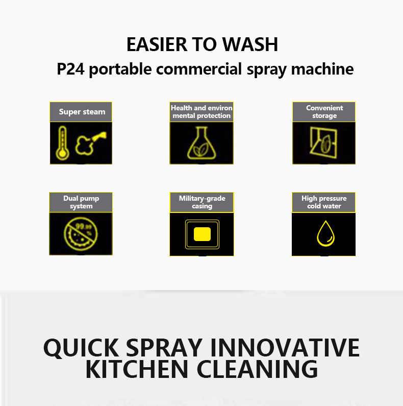 The P24 Chemical Spray Machine is a professional device that efficiently softens stubborn stains (especially grease) by spraying chemical agents (e.g., specialized degreasers, softeners) combined with temperature control (such as hot water assistance). It targets stubborn grease problems that traditional physical cleaning methods (like rag wiping, dry sweeping) fail to resolve.